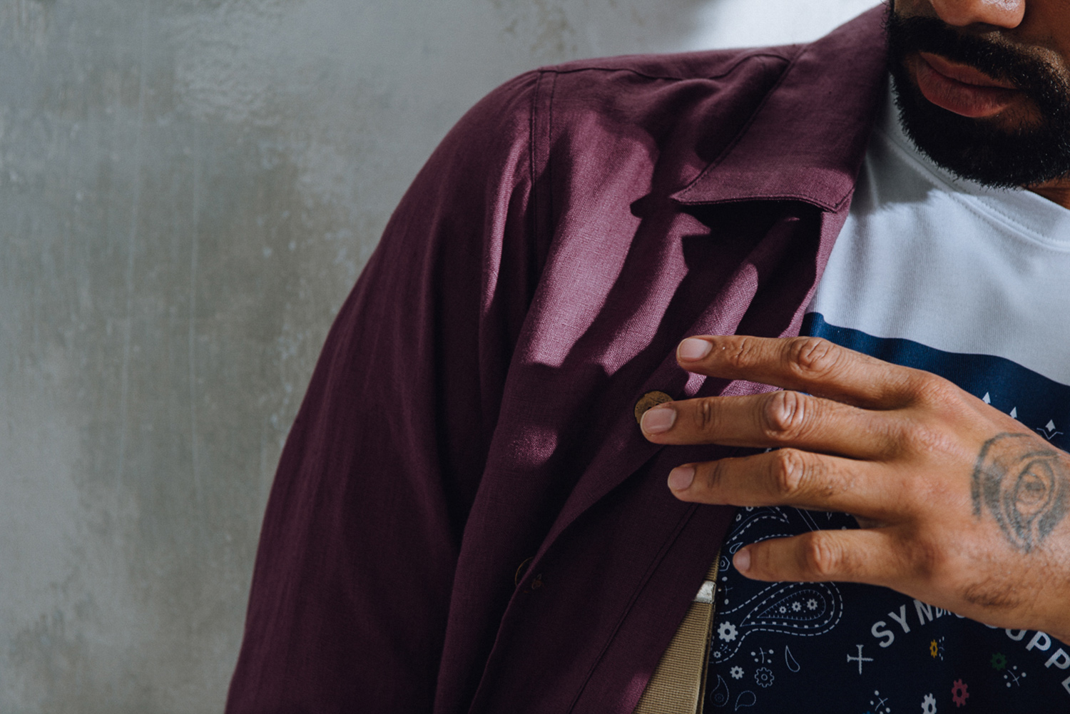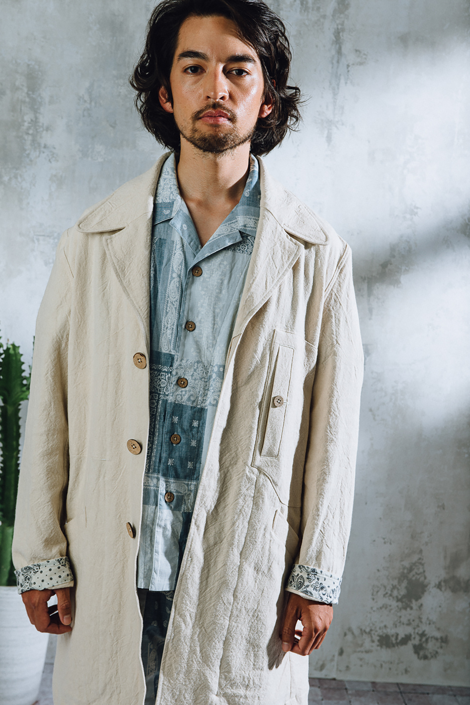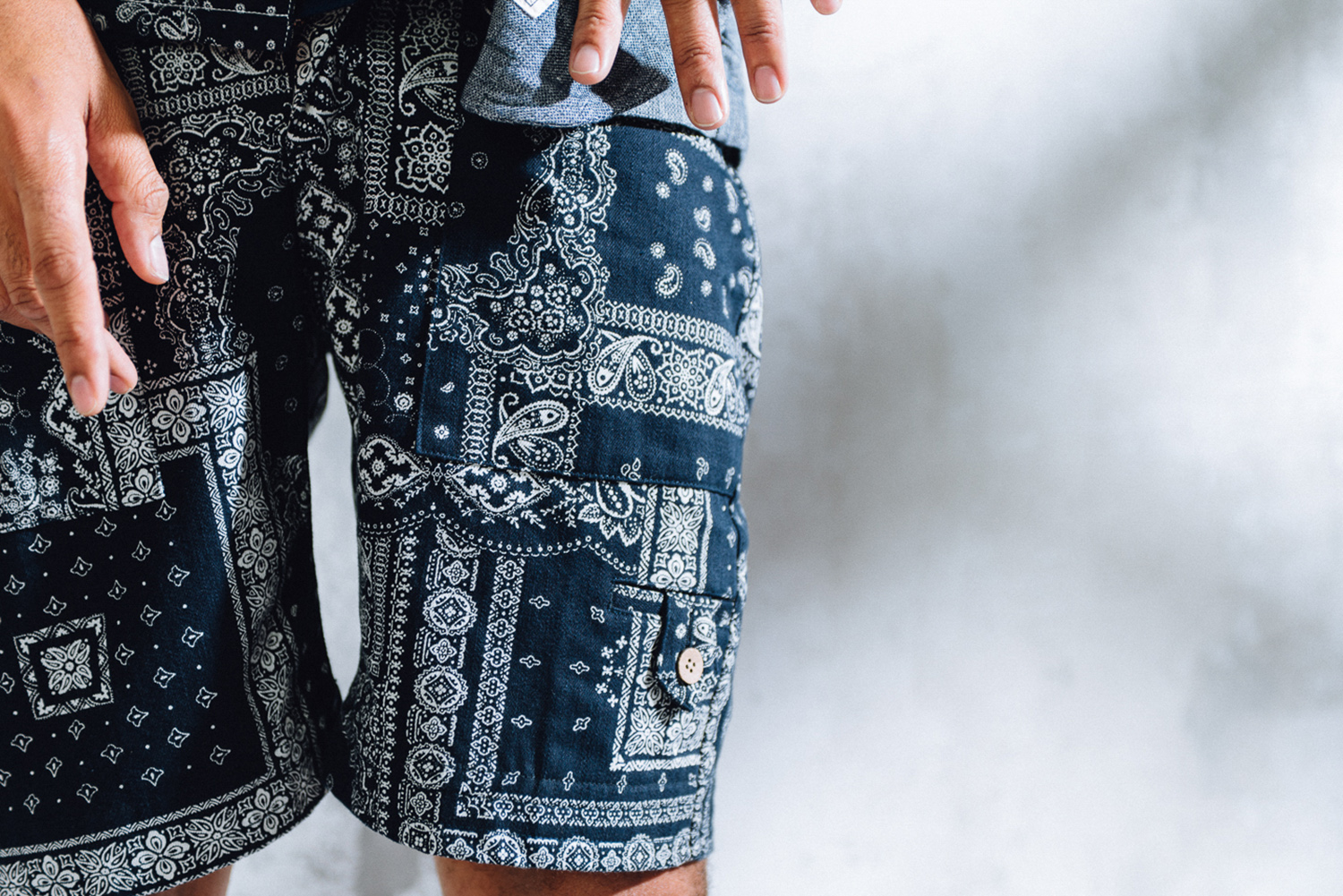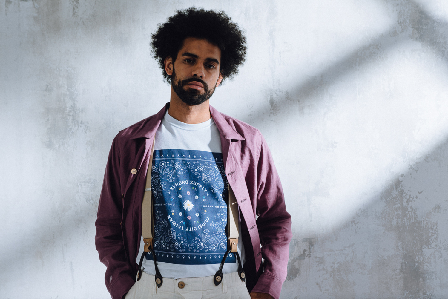 除了意大利面料,本季亦选用顶级法国亚麻、美国 Supima 棉,在台湾北部山区施以天然蓝染;此外并在日本制做全新配件商品,以「蓝染」和「柿渋染」两种天然染制技艺完成南方风情的 bandana 方巾,上有 SYNDRO 团队绘制的「WRENCH PAISLEY」工具变形虫花纹。 SYNDRO 希望搜集世界各地的优秀原料、与台湾本地职人工艺联名,为市场带来丰富的优质选择。