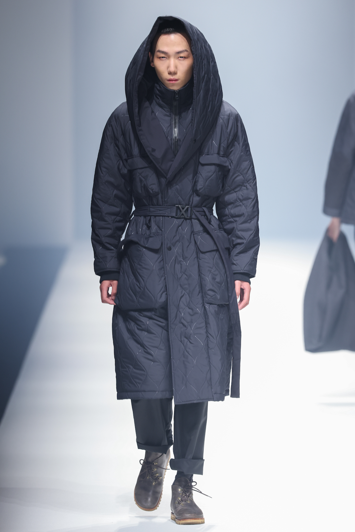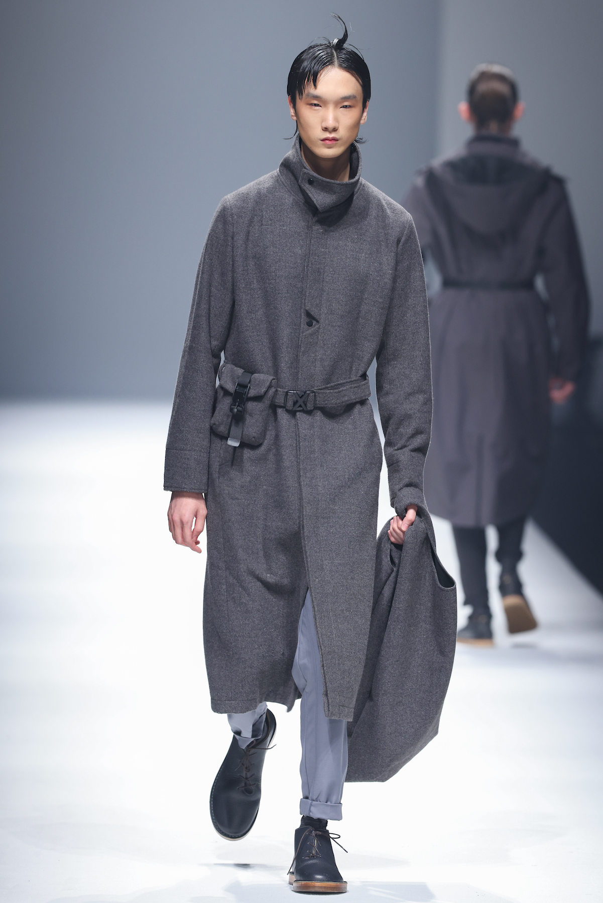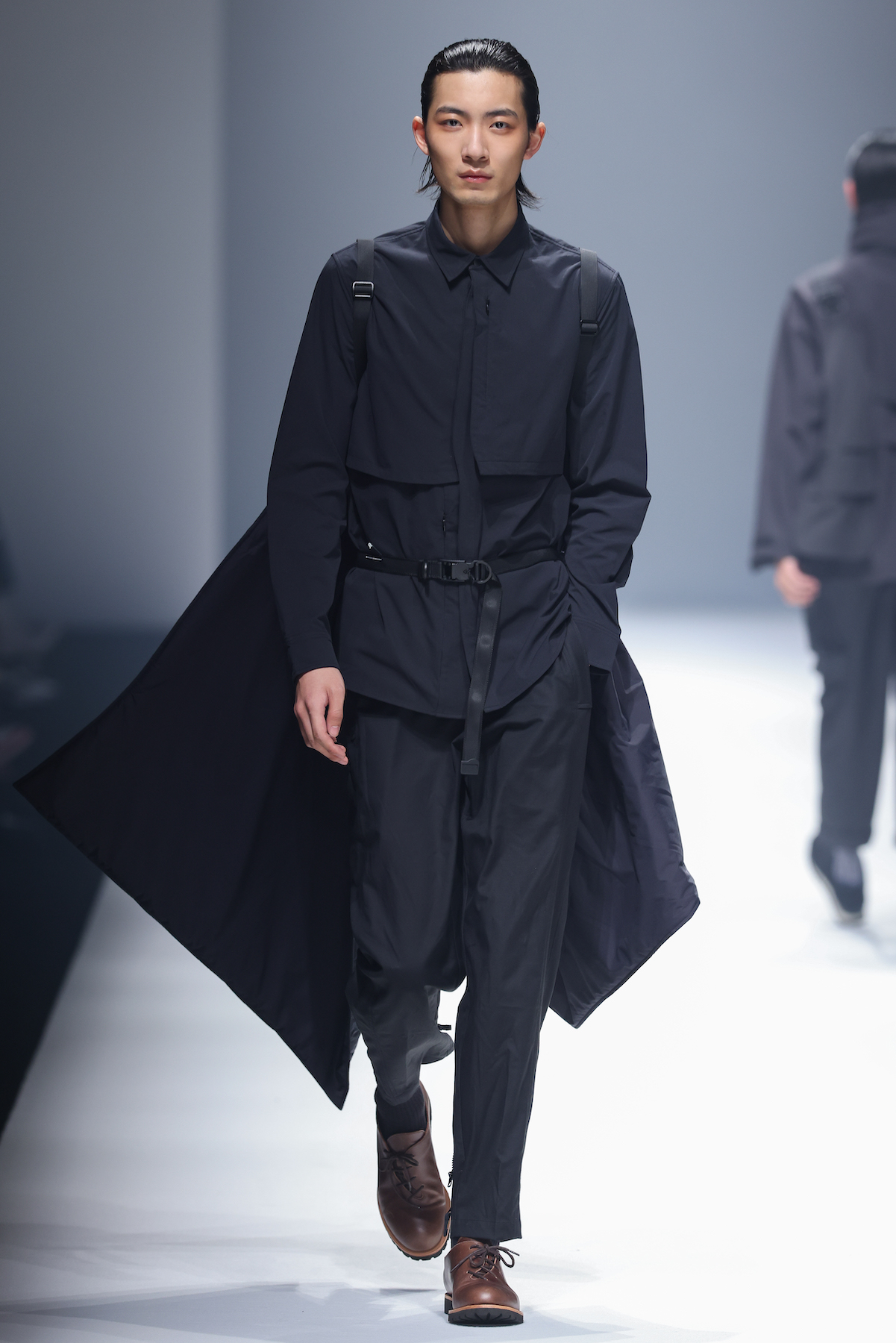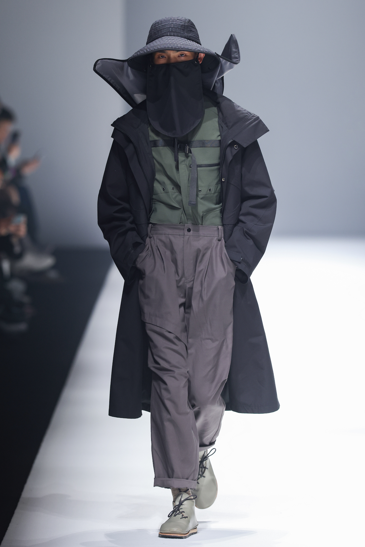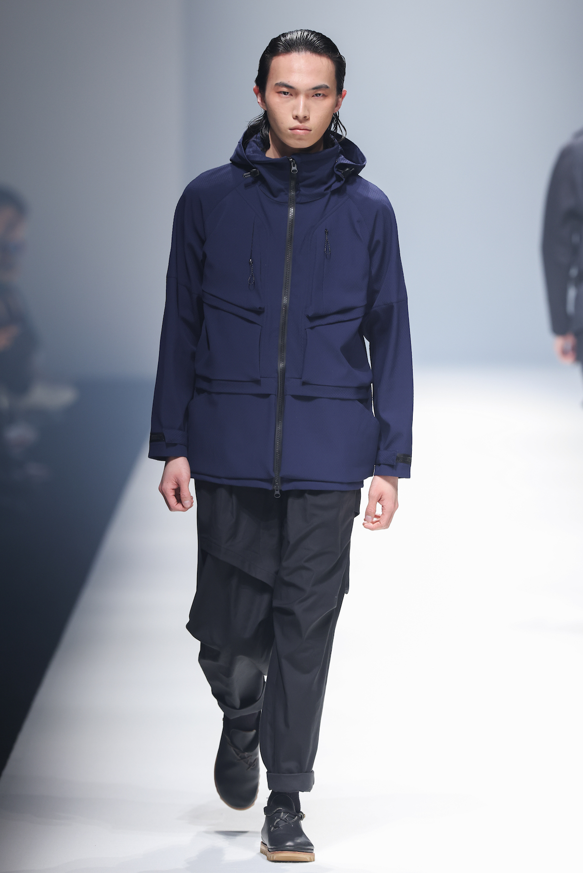 oqLiq 本季同时进入纽约时装周和伦敦时装周日程,以分集方式在两大时装周发布不同的场景和不同角色故事线,并以全 3D 虚拟秀做为电影预告片的伏笔呈现 oqLiq 宇宙观,而完整的 2021 秋冬系列此番终于在上海时装周正式公开。本季的设计理念延续春夏主题「风调雨顺」,品牌通常以同一主题贯彻春夏秋冬两季,以不同的季度完整上下集呈现,本季以订制回收材质制成蚀刻调性毛料,搭配 3XDRY® 及 CORDURA® 等科技面料构织出 oqLiq 的全新秋冬宇宙,演绎本地文化与机能布料的结合,体现东方都会机能美学。此外系列还以经典小说《封神榜》中的四大天王「剑琴伞龙」为灵感,将防「风」、机能「调」节、防「雨」和「顺」舒适的机能诉求,设计融入东方传统文化线条,考究 Vintage 军装功能,将汉字笔画廓形化作衣身剪裁,做出收纳结构及立体剪接线条。