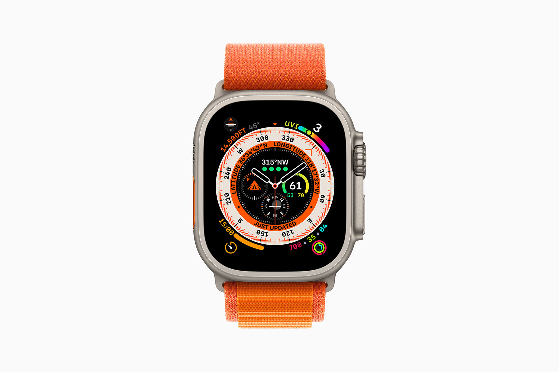 全新推出的 Apple Watch Ultra 针对耐力、探索及冒险的一系列极限运动设计,采用航太级钛金属制造,在重量、耐用性与耐蚀性之间取得完美平衡。表壳向上完整包覆平整蓝宝石水晶玻璃表面,保护亮度最高可达 2,000 尼特的 Retina 显示器,比其他 Apple Watch 显示器亮 2 倍。高对比国际橘的全新「动作」按钮可轻松自订,让用户能快速使用「体能训练」、「指南针航点」以及「回溯」等各种功能。产品拥有 Apple Watch 中最长的电池续航力,一般使用情况下最高可达 36 小时。此外,还有适合多日使用的全新低耗电设定,可延长电池续航力至 60 小时。