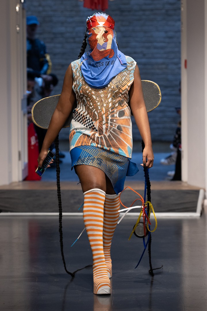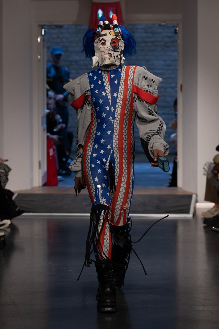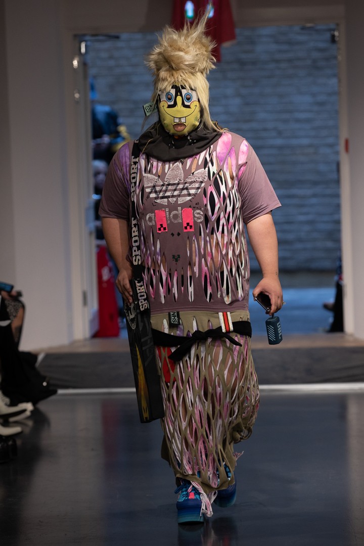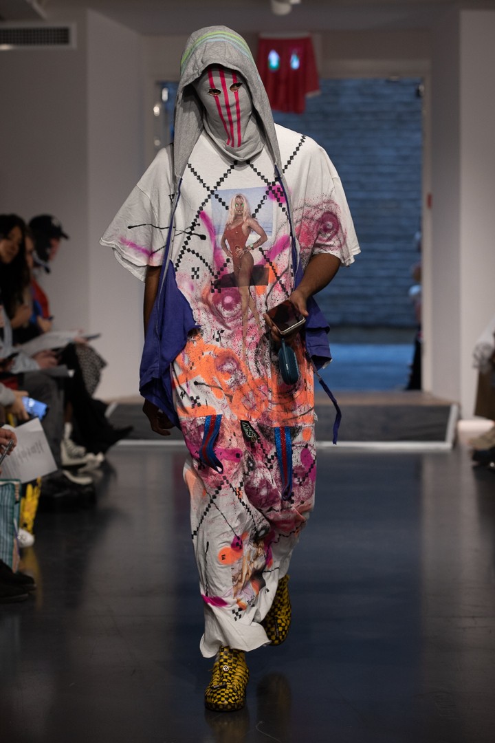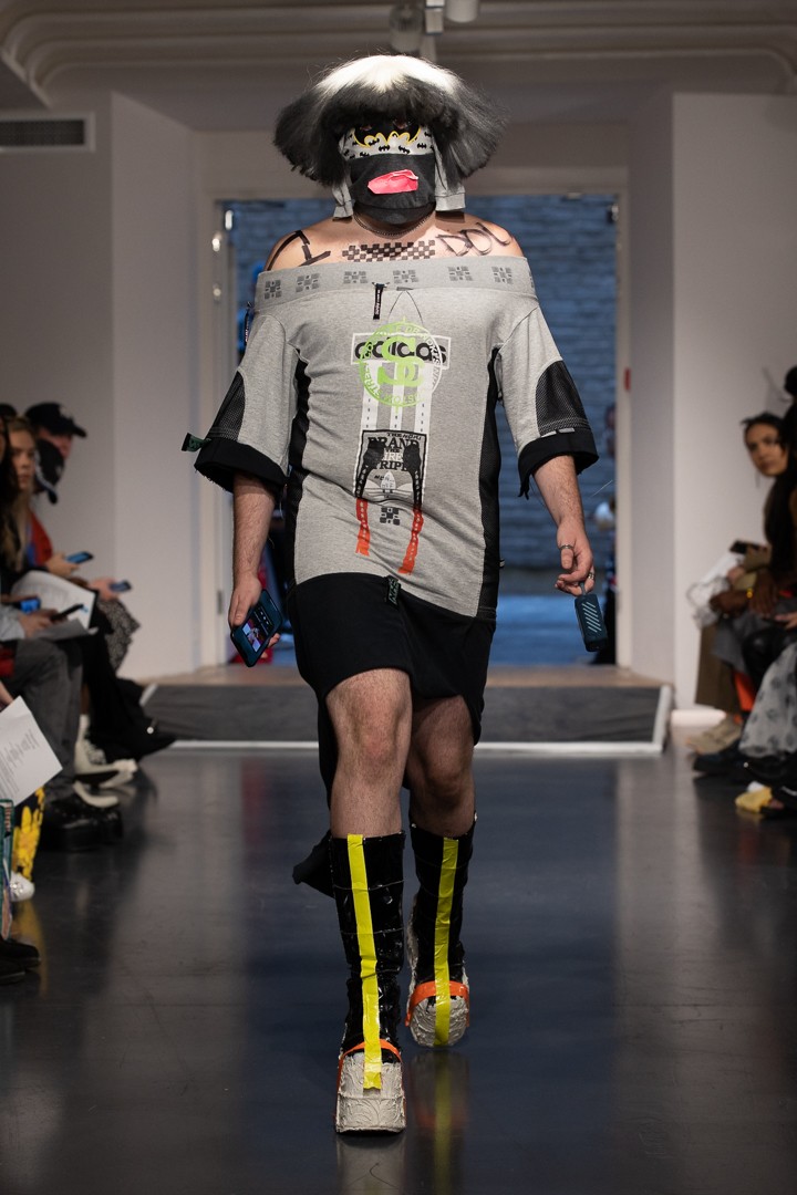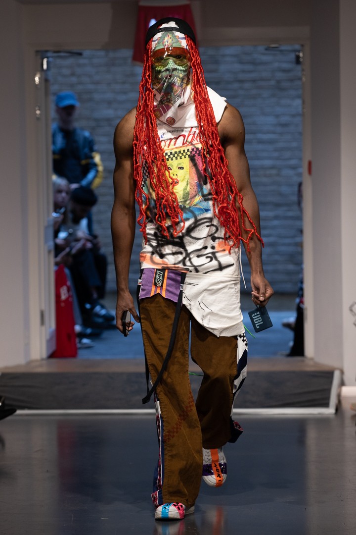 本季度不仅贯彻从回收废料中挑选素材的手法,更采用颠覆时装传统的外观传递叛逆信息,追求残破美学之余,也发挥创意大玩 Bootleg,将 adidas、PUMA、Playboy 等品牌,以及《The Simpsons/辛普森家庭》、《Star Wars/星际大战》、Minions、Mickey Mouse 等影视人物,融入有违常理且毫无限制的设计,却意外规距地赋予每套造型名称,像是「FACEBOOK STARTS WAR」、「KAREN WITH A K」、「MONKEY POX」、「SHREDDED MINIONS ZINE」,藉另类实验性的风格,带给观众刺激的视觉享受。