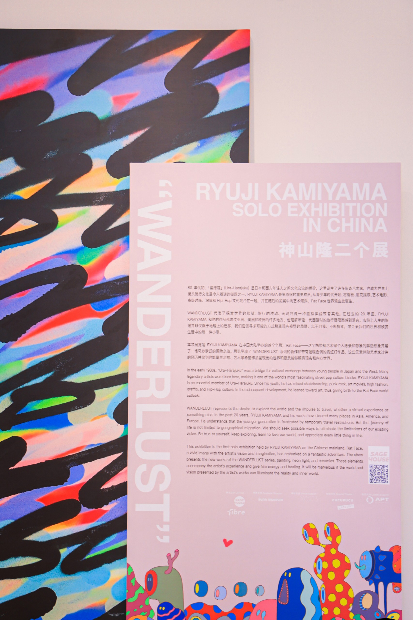 「WANDERLUST」展览现场带来了艺术家一系列以「RatFace」和「Stupid Bubbles」为主的新作,8 个带有温暖色调的霓虹灯作品和 2 个陶器作品。为加强与观众的互动,主办单位 SAGE HOUSE 与神山隆二亦将此前出现于日本个展上的屋子概念「搬到」现场并重新演绎,更设置了一个全新的体验空间。感兴趣的读者不妨前往。