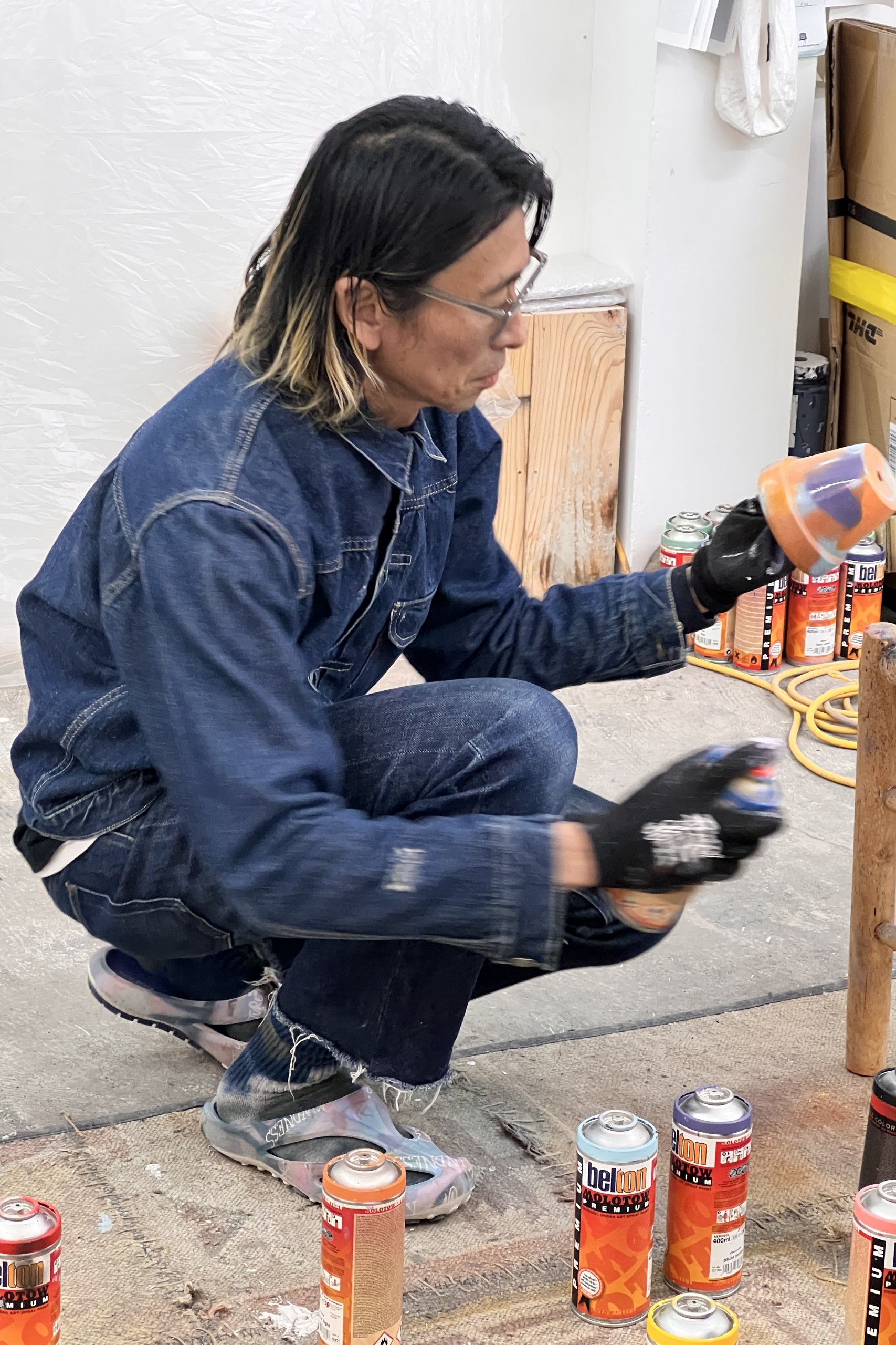 神山隆二:一开始,我的作品大多是丝印拼贴,但近十几年来,我专注于「喷涂」和「毛笔书写」。同时,我也很喜欢霓虹灯管,最近也在做陶瓷等立体作品。我非常喜欢并享受与新材料的对话的过程。我使用很多材料和工具来创作我的作品。我喜欢使用各种工具并试着与我想用的材料结合起来,我试着在各种各样的事情上不假思索地工作。