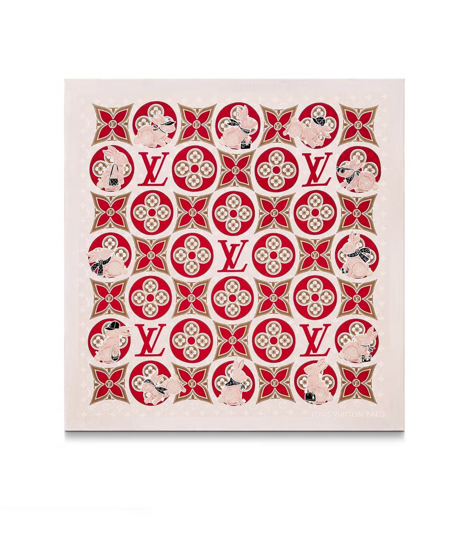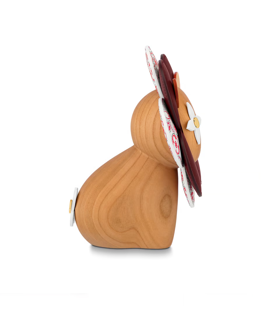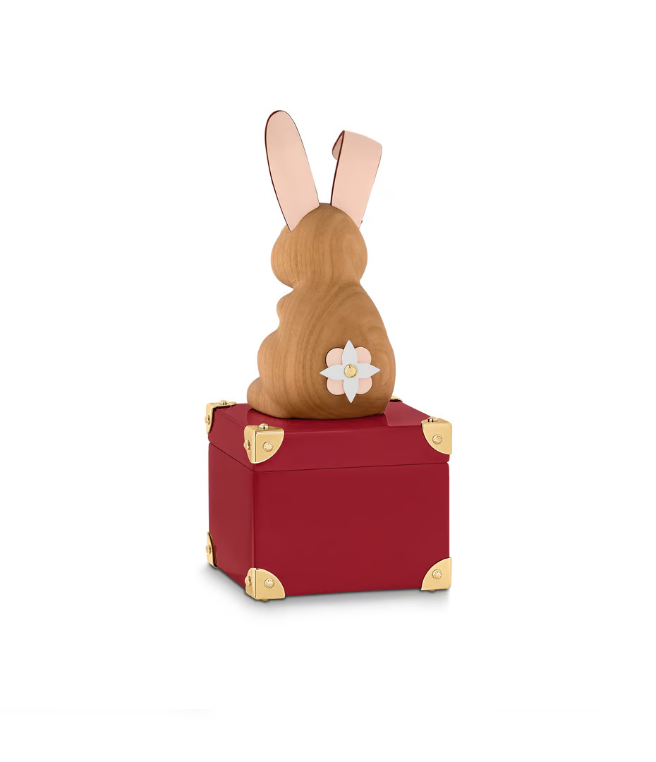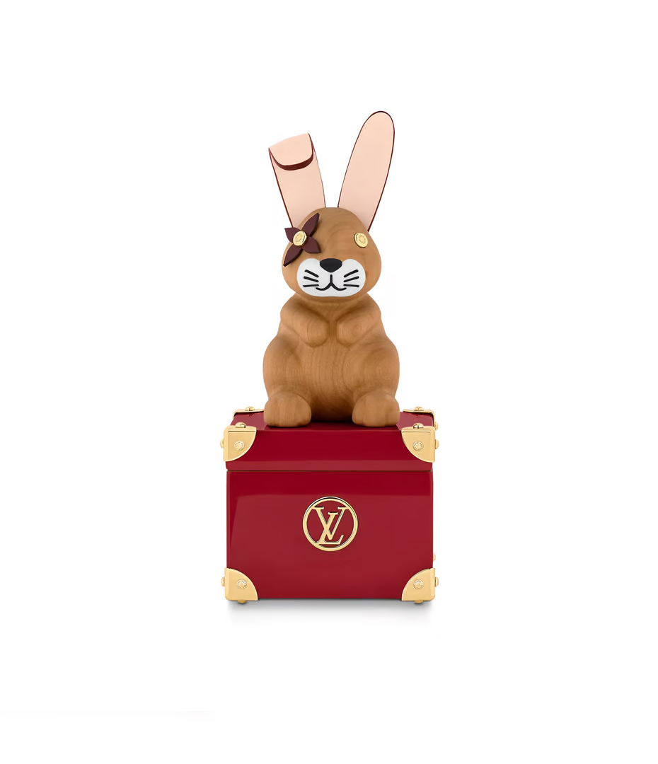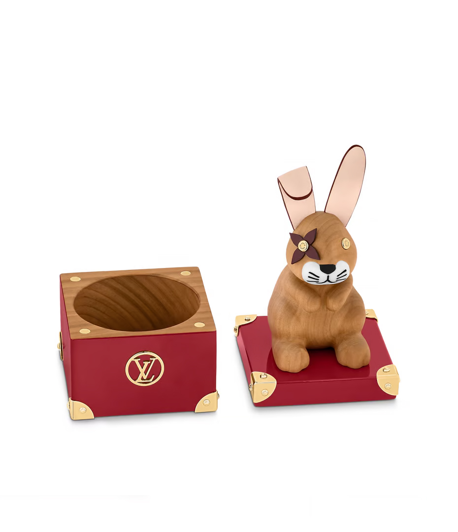 Maison 角色「Vivienne」的特别版登场, 耳朵进行了加长,鼻子也设计成兔子的样子。 四个花瓣采用实木和光滑皮革精制而成,饰有彩色 Monogram 图案, 同时将尾巴利用白色花瓣与 LOUIS VUITTON 压印饰钉相结合。兔子包挂饰和钥匙扣进行了独有设计,挂饰以从手提包「Boite Chapeau」的缩影中探出头来的银色兔子为造型,镶嵌眼睛的兔子表情和精美的 Monogram 字母图案交织,体现精美细节。兔子盒子摆件正面带有 LV 圆圈并含磁扣,木质的兔身与皮革材质五官碰撞,眼睛和尾巴饰有标志性的 Monogram Flower 图案。此外推出的两款丝巾则是形象地描绘了戴着路易威登棒球帽和手提包的兔子造型, 反面则是经典的交织字母图案,采用 100% 丝绸材质,极具存在感。